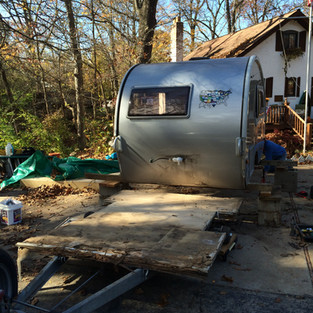 Dane removed absolutely everything from the T@B except the upper front and rear cabinets, carefully bagging and labeling all the parts and hardware. The factory shipped us a new floor and on a cool November day, we pried the body off of the old floor, rolled out the old floor and left Sputnik suspended in mid-air on a collection of bottle jacks, concrete blocks and lumber. After removing the trailer chassis from the old floor and installing it on the new one, we reversed the process and began to put Sputnik together again.